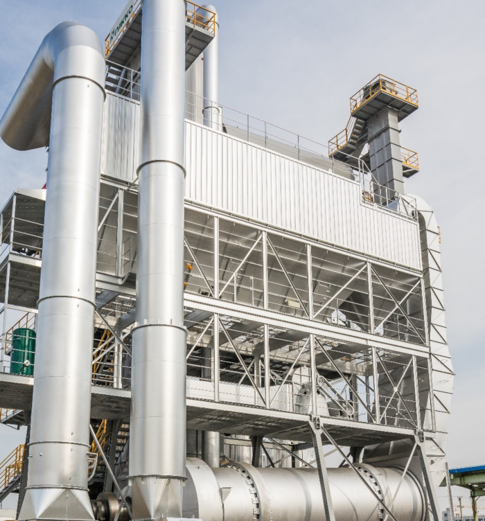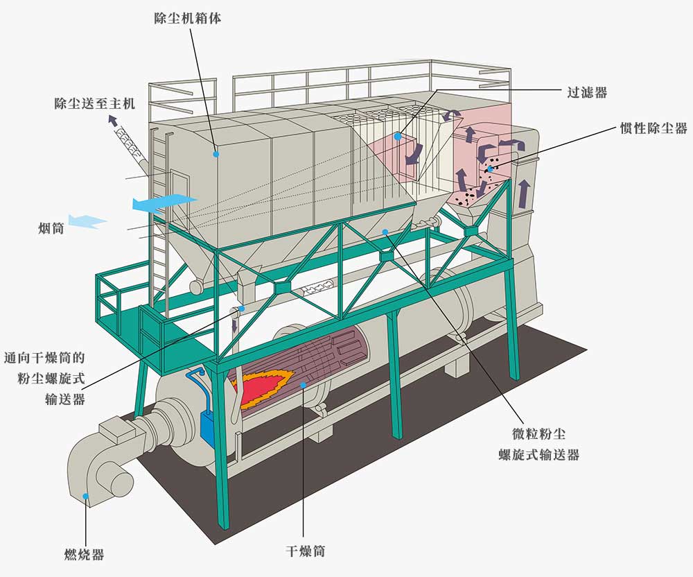 袋式除塵器設(shè)置于干燥滾筒上方使煙道縮短,散熱面積大幅減少。采用高壓脈沖清洗方式,布袋損耗小,壽命長(zhǎng),除塵效果好。
